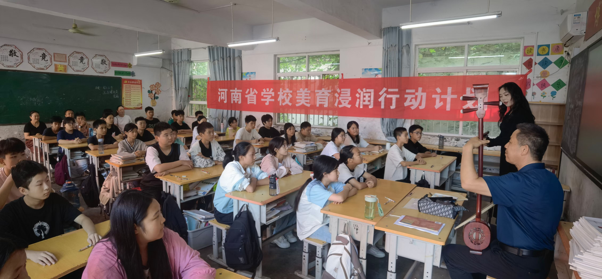 在宝丰县张八桥中学,我院行业教师王占军给同学们讲解了曲艺的种类和特点,教授了同学们使用简板的方法,还让同学们欣赏了一段河南坠子《偷石榴》选段,大家听得津津有味;魏波老师又给同学们展示了一种便携式管乐器陶笛,同学们对这个未知乐器充满了好奇心,为了让同学们更好地认识这个乐器,魏老师吹奏了一首《上春山》,同学们不由得哼唱起来,气氛很是活跃。