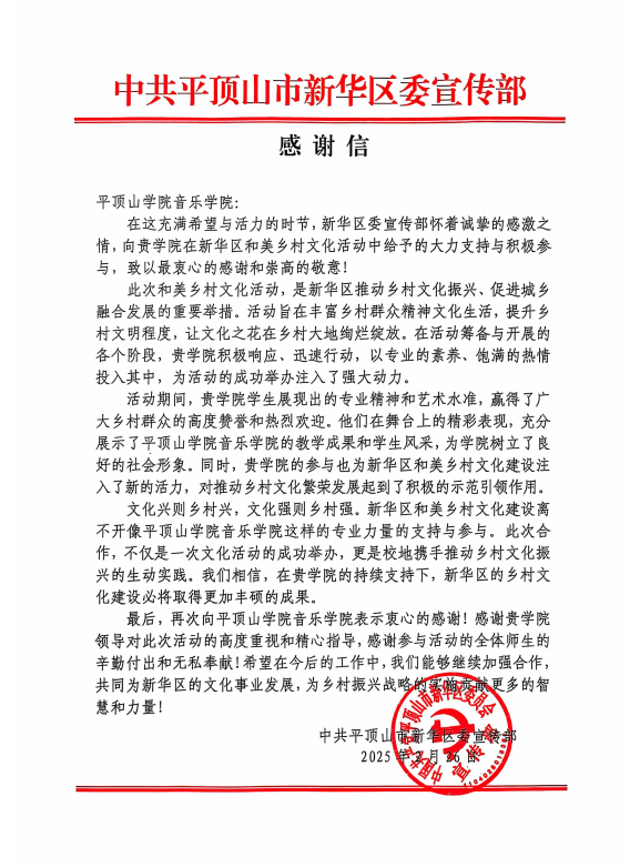 近日,新华区委宣传部向太阳成集团tyc9728发来感谢信,对太阳成集团tyc9728在新华区和美乡村文化活动中的大力支持与积极参与表达了诚挚感谢与崇高敬意。此次活动不仅是一次文化盛宴的成功举办,更是校地合作助力乡村振兴的生动实践。