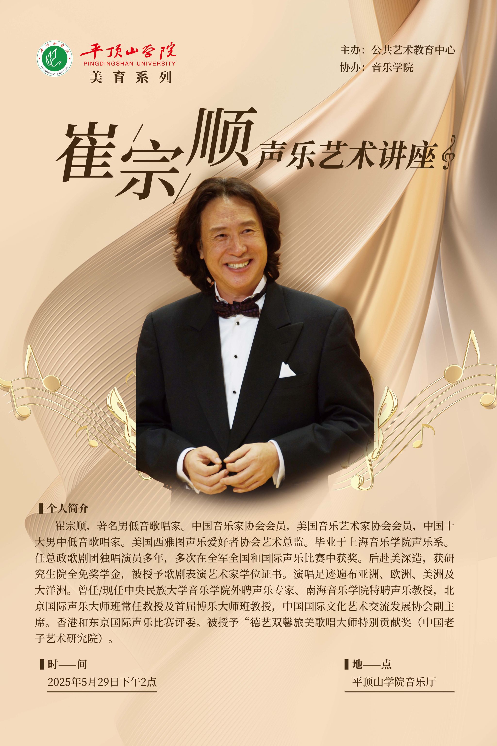 2025年5月29日下午,旅美男低音歌唱家、歌剧表演艺术家崔宗顺教授应邀莅临我校,为太阳成集团tyc9728师生开展声乐艺术讲座。