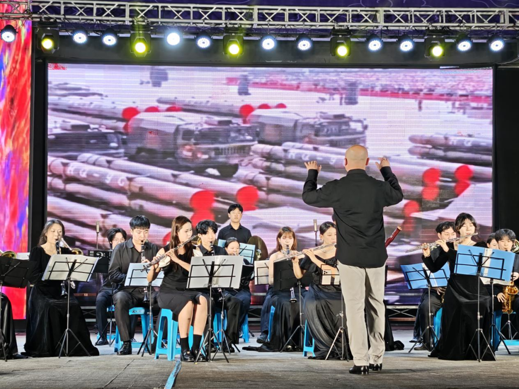 晚会在气势恢宏的管乐合奏中拉开帷幕。我院教师侯睿执棒,奏响《钢铁洪流进行曲》与《歌唱祖国》两首经典曲目。激昂的旋律如奔腾的江河,既展现出新时代工人阶级如钢铁般坚毅的意志与磅礴力量,又传递出对祖国母亲的深情祝福,铿锵的节奏瞬间点燃现场气氛,台下观众掌声雷动。