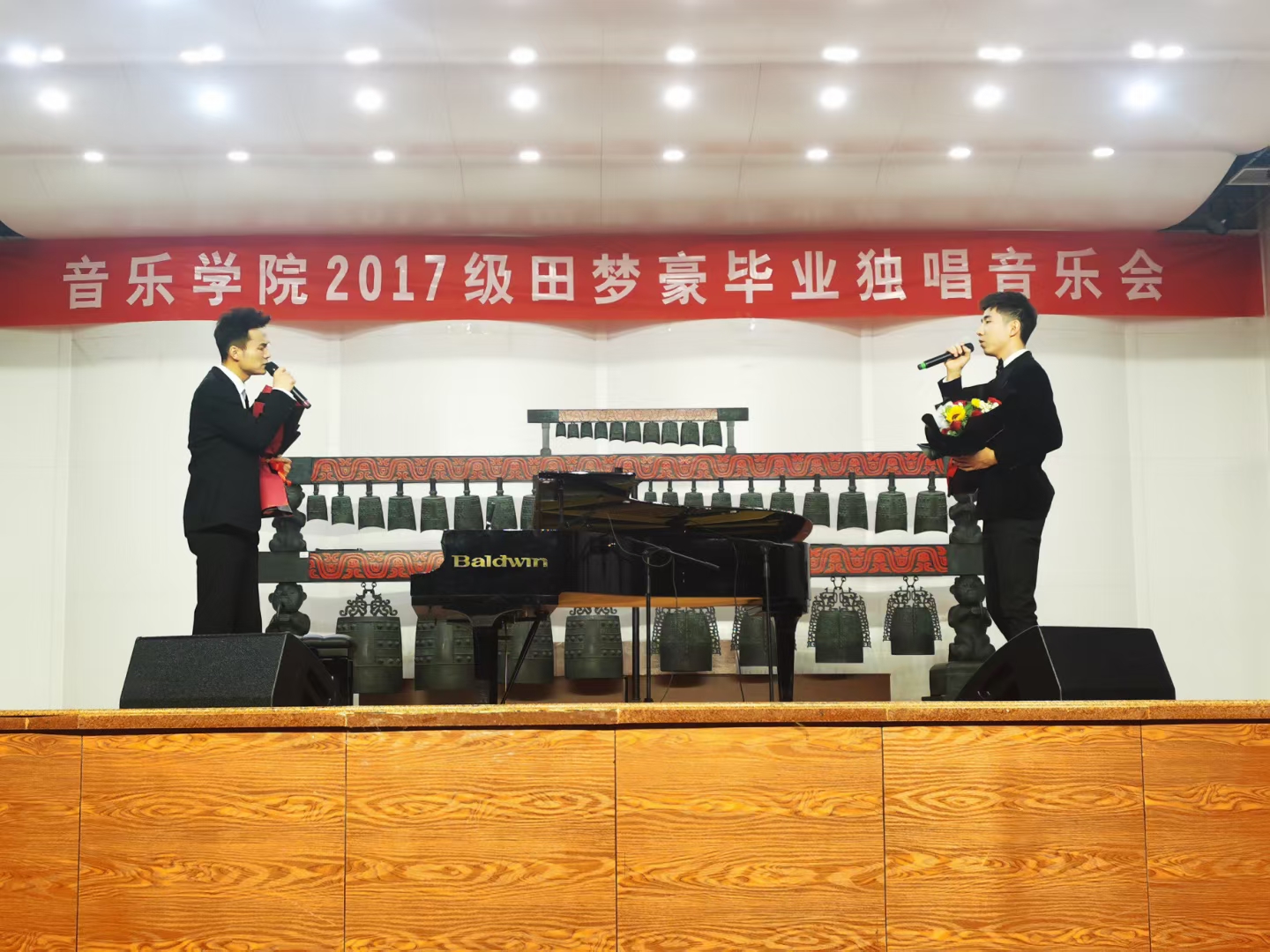 音乐会结束曲目汤莉老师与学生田梦豪共同演唱的歌曲《我的深情为你守候》更是把音乐会的情绪推向了高潮,“不管什么时候,不管什么地方,我的深情为你守候”,歌曲饱含浓浓的师生情与即将要离别的哀愁,令人动容!