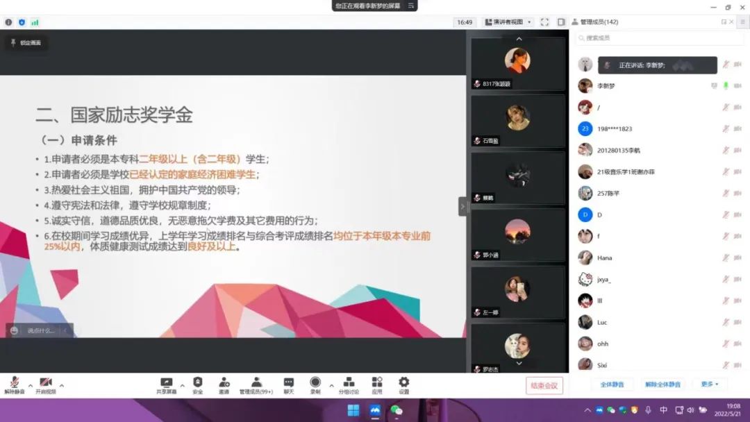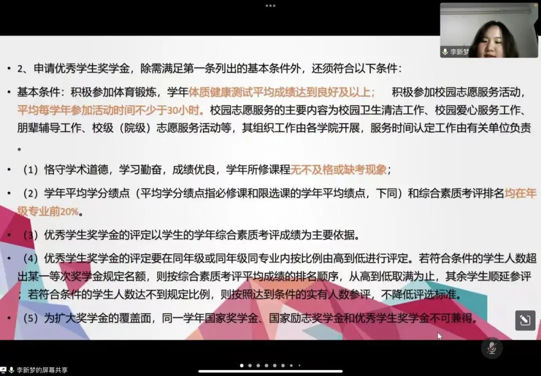 会议伊始,李新梦老师对本次主题班会的活动流程、背景、目的和要求进行了详细介绍。她用PPT讲解了国家奖学金和国家励志奖学金的申请标准、评审及发放相关程序,并系统地讲述了学校奖学金的一系列要求。