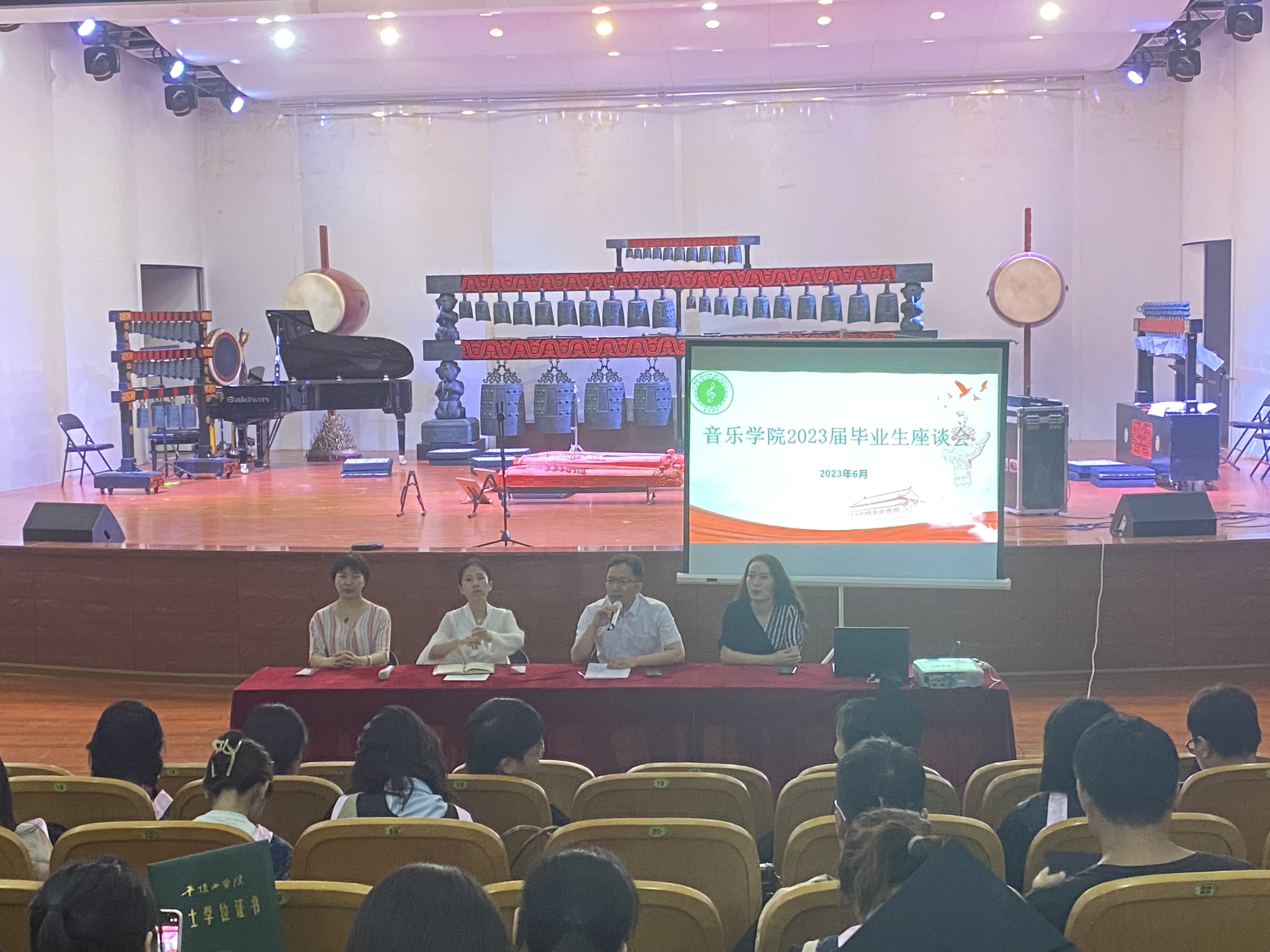 座谈会的最后,老师们纷纷上台送上了自己的祝福和期望。他们耐心倾听了学生们的问题和困惑,并给予了宝贵的建议和指导。一位老师表示,音乐教育需要与时俱进,不断适应社会和行业的发展变化,“我们要关注现代音乐的发展趋势,培养学生们的创造力和创新精神,随着科技的进步,音乐创作和表演的方式也在不断改变,学生们需要具备与时俱进的能力和视野。”整场座谈会氛围融洽且饱含希望,在座谈会结束后,毕业学生们纷纷表示很受鼓舞,对未来充满信心。他们也将继续努力学习,积极应对未来的音乐挑战,并为音乐教育的发展贡献自己的力量。