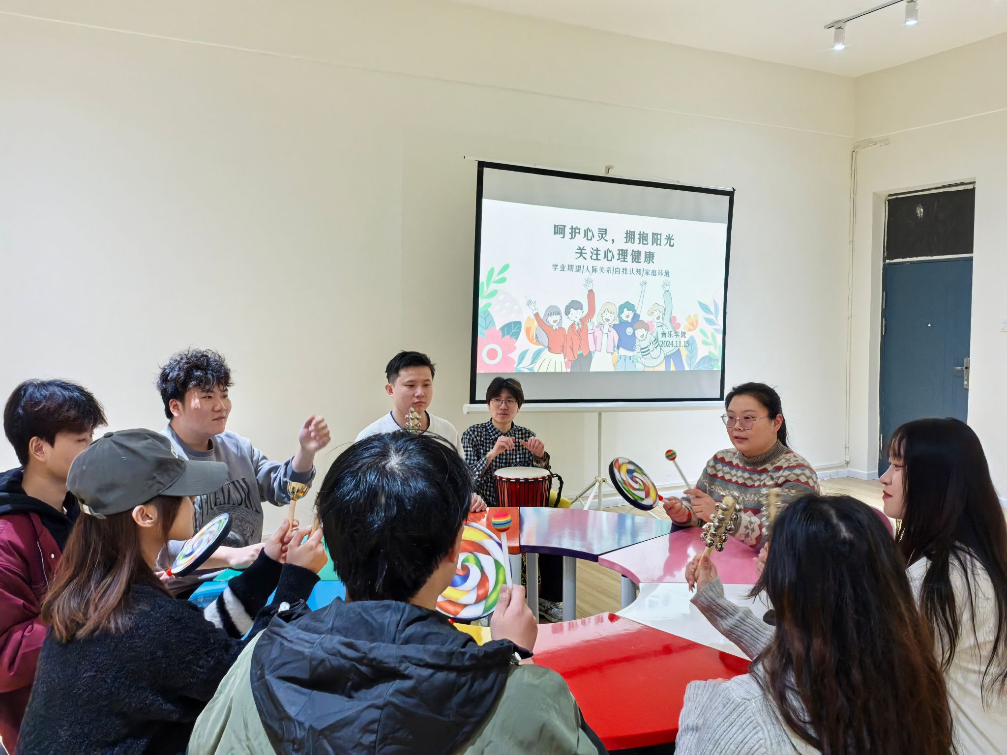 此次奥尔夫音乐治疗团体辅导活动,为心理委员们提供了全新的工作思路与自我成长路径,他们将带着这份音乐赋予的温暖与力量,为校园心理健康防线添砖加瓦,助力同学们在青春路上自信前行,共同谱写和谐美好的校园心灵乐章。