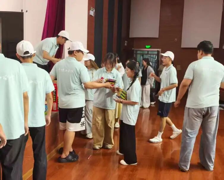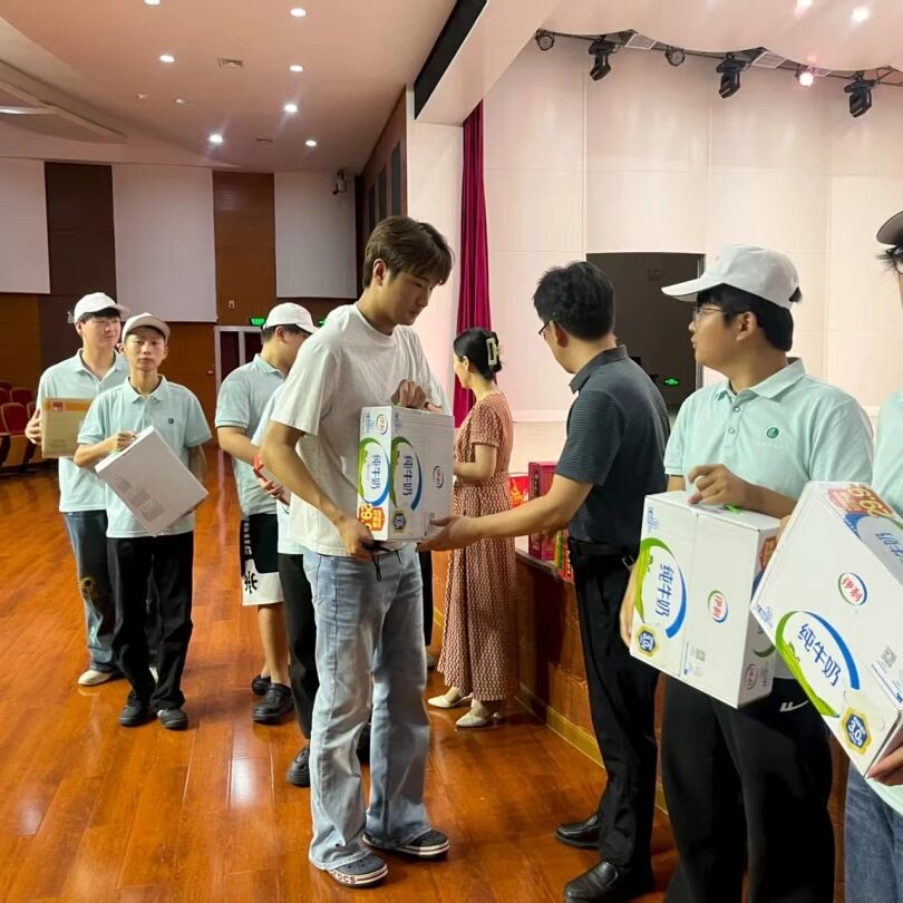 学院领导与志愿者们亲切交流,详细了解排练进度和生活保障情况,并送上牛奶、面包等慰问物资。程志奎叮嘱大家:“近期持续高温,大家要科学安排作息,做好防暑降温,以健康体魄保障实践任务高质量完成。”学院的关怀让大家倍感温暖,将以更高热情投入后续工作。