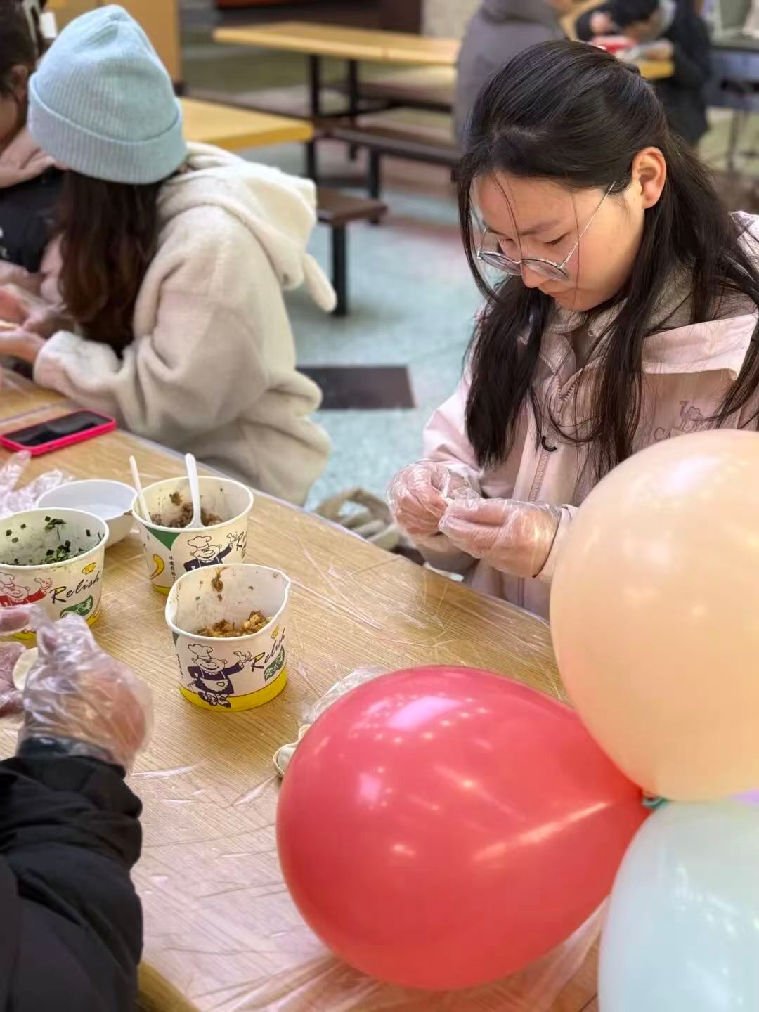 活动前期,学院精心筹备,提前准备好饺子皮,馅料,手套等,布置活动场地。活动开始,大家迅速分组协作,和面、擀皮、包馅分工明确又默契十足,现场一派繁忙又欢乐的景象。