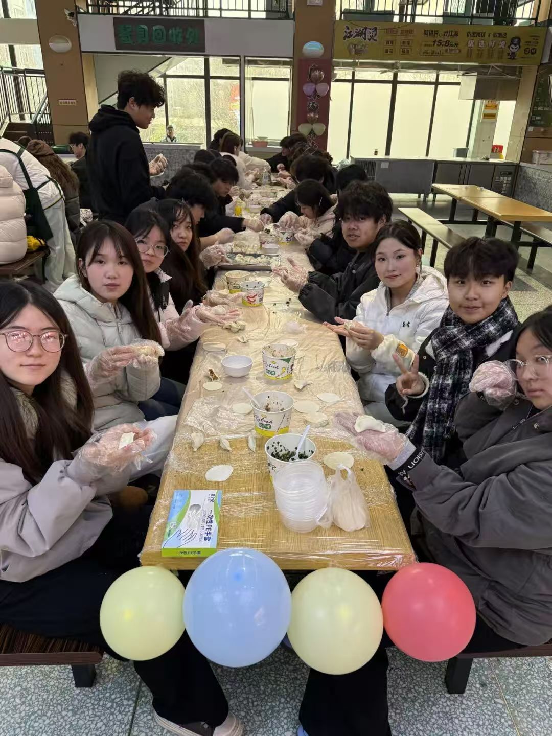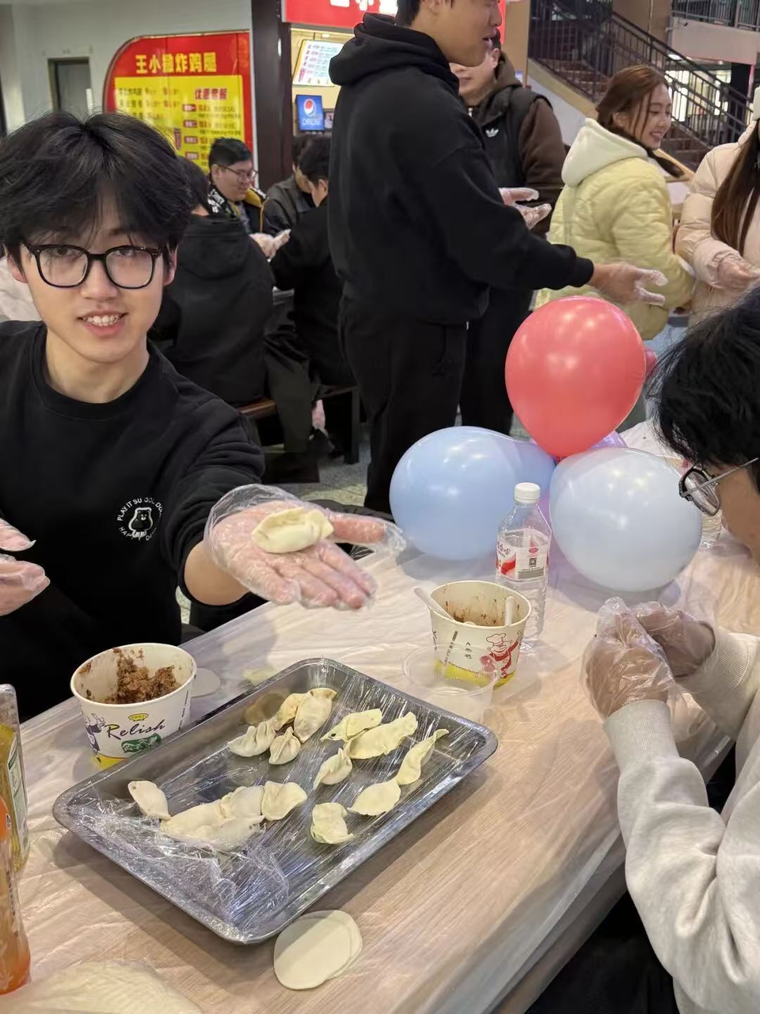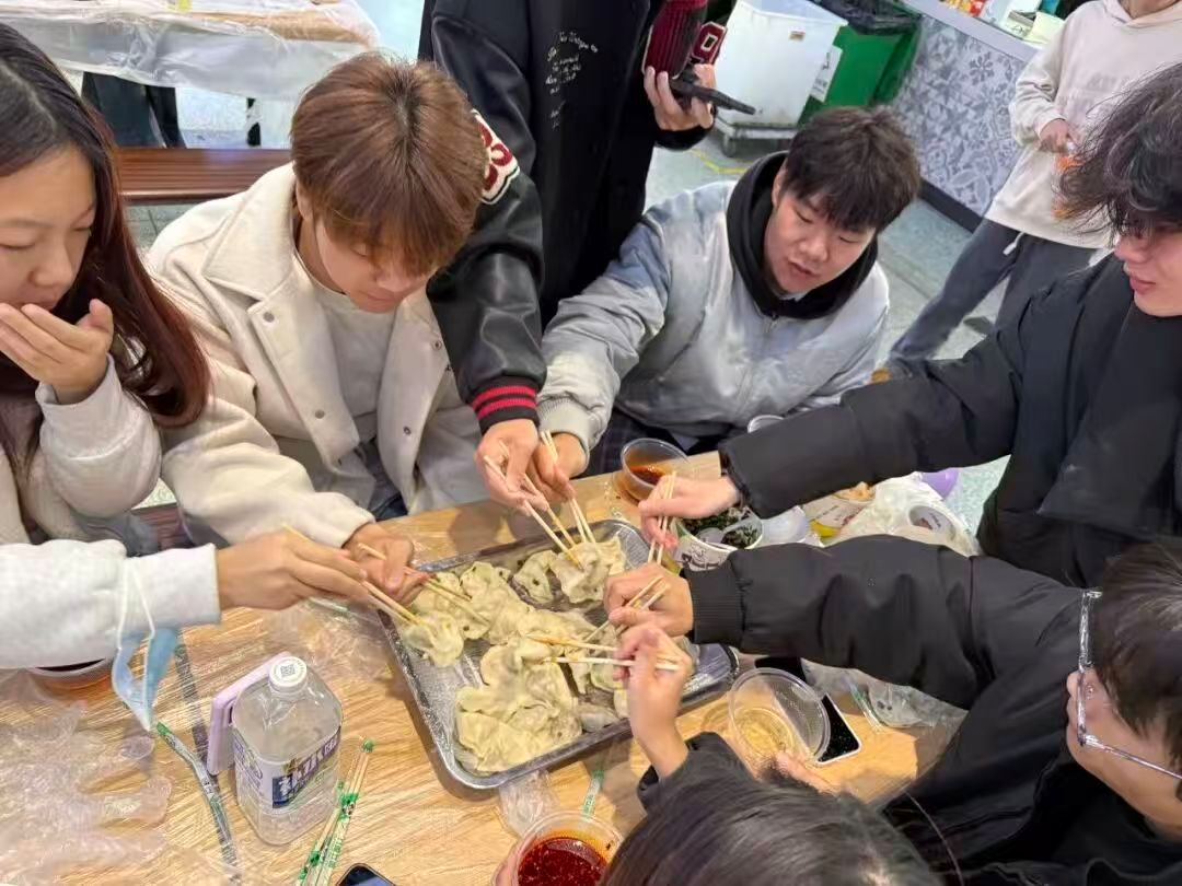 待饺子下锅,沸水翻滚间,一个个饺子浮起熟透,捞出装盘后热气腾腾、香气扑鼻。师生围坐一桌,共享亲手包的饺子,大家一边品尝美味,一边分享生活趣事,每一口热饺都暖胃暖心,让远离家乡的学子也感受到“家”的温暖。