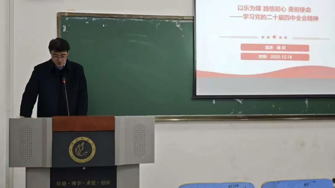 杨老师以《以乐为媒 践悟初心 勇担使命——学习贯彻党的二十届四中全会精神》为题,系统阐述了全会精神的核心要义,重点解读了推进国家治理体系和治理能力现代化的重要意义。他从音乐艺术与时代使命相结合的角度出发,引导师生深入思考音乐工作者在新时代的使命与担当。