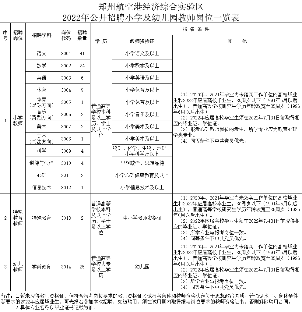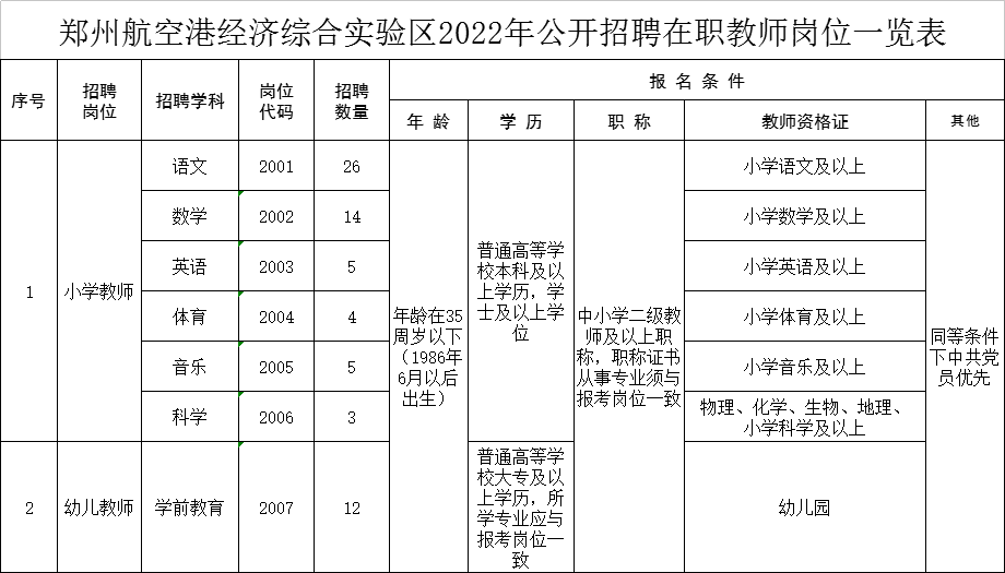 本次计划招聘在职教师69名,高校毕业生124名。各专业岗位、招聘计划、具体要求等详见《郑州航空港经济综合实验区2022年公开招聘在职教师岗位一览表》(附件1)、《郑州航空港经济综合实验区2022年公开招聘小学及幼儿园教师岗位一览表》(附件2)。