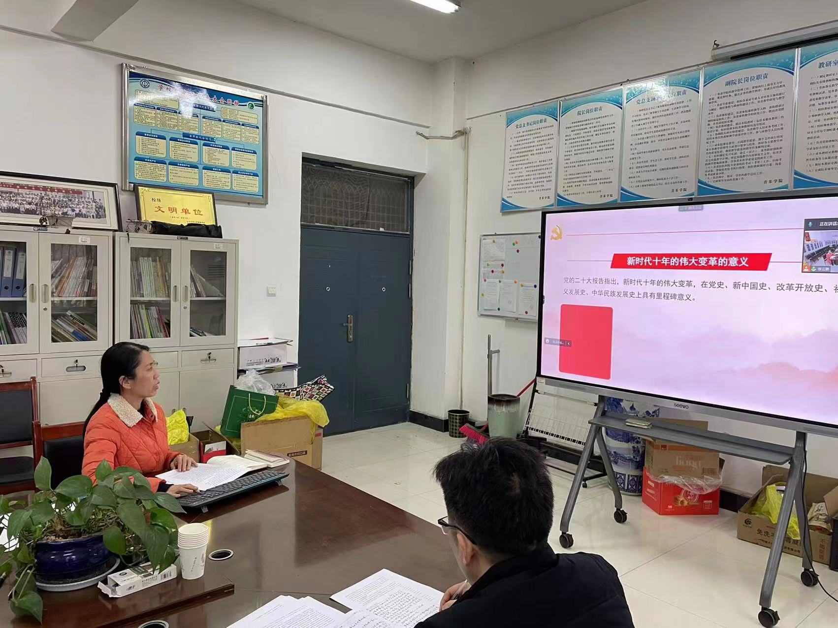 最后,潘刻科指出,我们要把学习宣传贯彻党的二十大精神作为我院当前和今后一个时期的首要任务,坚决维护党中央权威和集中统一领导,自觉在思想上政治上行动上同党中央保持高度一致,用党的最新理论成果武装头脑、指导实践,开展工作。全面贯彻党的教育方针,落实立德树人根本任务,深入开展社会主义核心价值观宣传教育,深化爱国主义、集体主义、社会主义教育,把青年工作作为战略性工作来抓,加强对青年学生的思想引领,用党的科学理论武装青年,用党的初心使命感召青年,努力培养有理想、敢担当、能吃苦、肯奋斗的新时代好青年。要坚持中国特色社会主义文化发展道路,增强文化自信,坚持为人民服务、为社会主义服务,传承红色基因,赓续精神血脉,勇担时代使命,充分发挥专业特色和人才优势,在新时代新征程上展现新担当新作为。