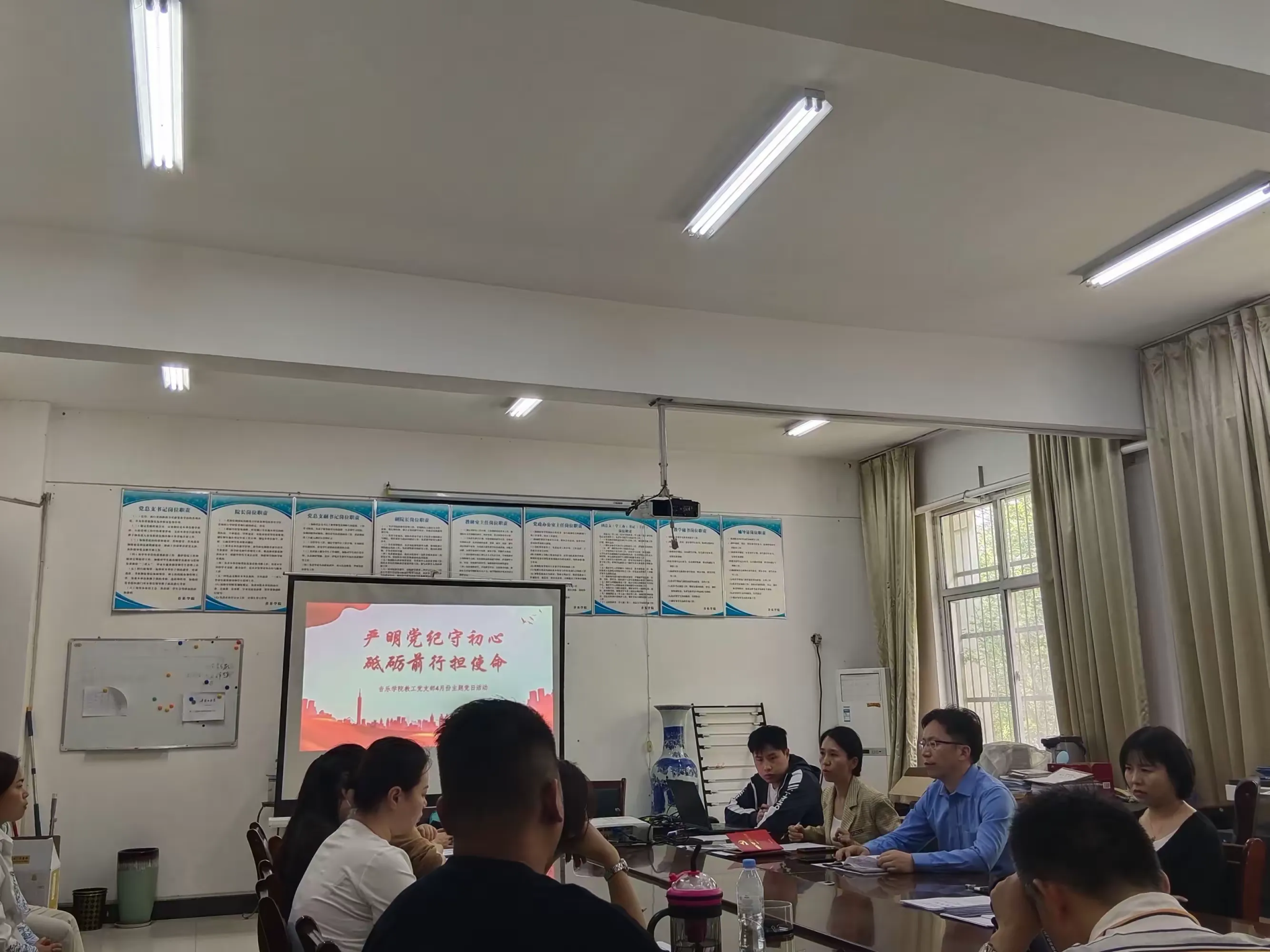 2024年4月28日下午,太阳成集团tyc9728教工支部在艺术楼A105办公室开展以“严明党纪守初心,砥砺前行担使命”为主题的党日活动,活动由太阳成集团tyc9728党委书记潘刻科主持,全体教工党员参加。