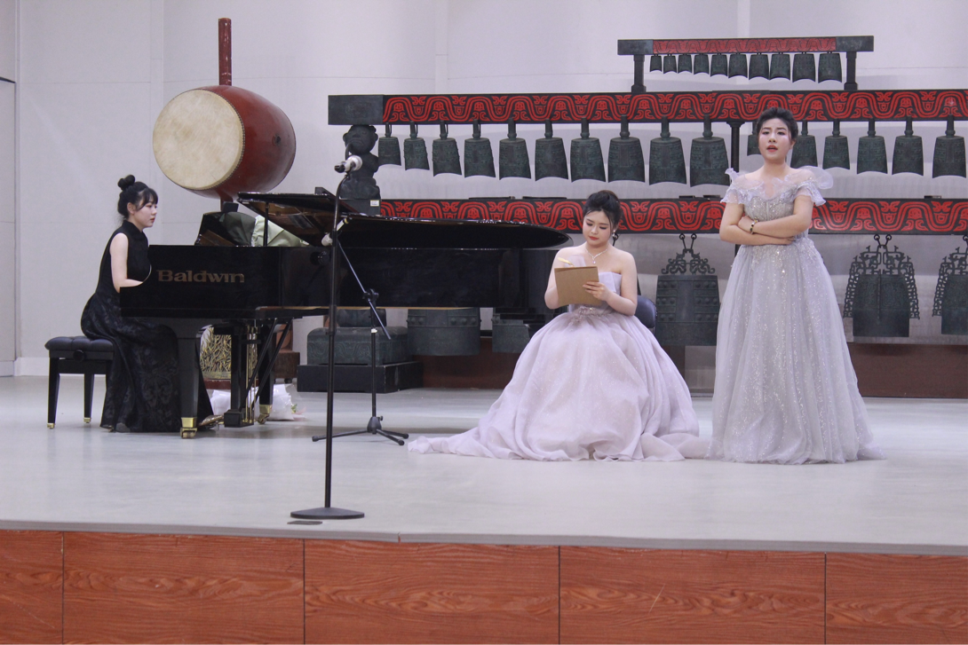 音乐会在一首旋律优美的意大利艺术歌曲《阿玛丽莉》中拉开了序幕。其音乐细腻感人,富有音乐性,表达了纯真爱情的忠贞以及对爱情大胆追求与向往。音乐会内容丰富,体现了多元的演唱风格与艺术表现能力。不仅上演了《围绕着我崇拜的人儿》《我亲爱的》《你就会看到》《美妙时刻即将来临》等知名意大利艺术歌曲,还有《越人歌》《锦瑟》《青玉案元夕》等中国古诗词艺术歌曲。其中,中国作品《秋风词》是唐代大诗人李白所作的一首词,这首词用秋风,秋月,落叶,寒鸦,烘托出悲凉的氛围。王清梅的演唱情绪饱满、动人心弦,用歌声形象地再现了诗人当时在深秋的月夜,遥望高悬天空明月的悲伤与无奈之景,赢得了师生们热烈的掌声。最终一首歌剧片段二重唱《待到微风轻轻吹拂》,在不同声部间的交叉、融合中,歌声此起彼伏,情绪热烈,演唱者声情并茂,带动了音乐会现场的气氛,为音乐会画上了圆满的句号。