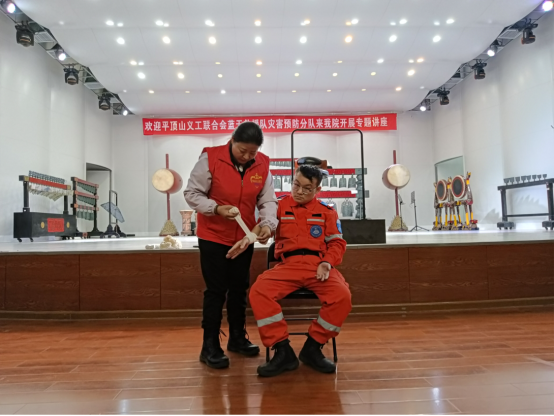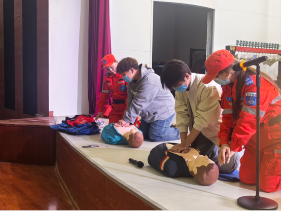 活动中,蓝天救援队队员讲授了实验室防火防电安全知识、创口紧急包扎以及突发紧急情况处理方法等实用的知识内容。同时设计模拟场景,指导学生们开展应急救援实践演练。