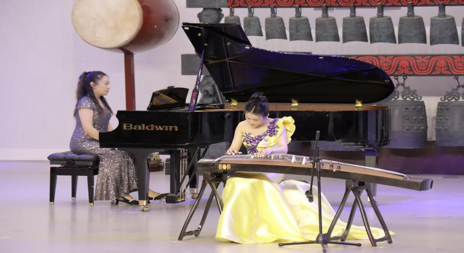 下半场,李昊真携手钢琴伴奏李瑞奇演绎《秦土情》,他们以细腻的情感与娴熟的技巧,将陕西大地的厚重历史与深沉情感诠释得淋漓尽致,每一个音符都饱含着对故土的眷恋与热爱,引发了现场观众的强烈共鸣。而古筝重奏《卧虎藏龙》更是将音乐会推向高潮,李昊真与石佳、潘湘阳在打击乐与钢琴伴奏的配合下,用铿锵有力的演奏再现了江湖的快意恩仇,激烈的节奏与跌宕起伏的旋律,仿佛让观众置身于刀光剑影、侠骨柔情的武侠世界。